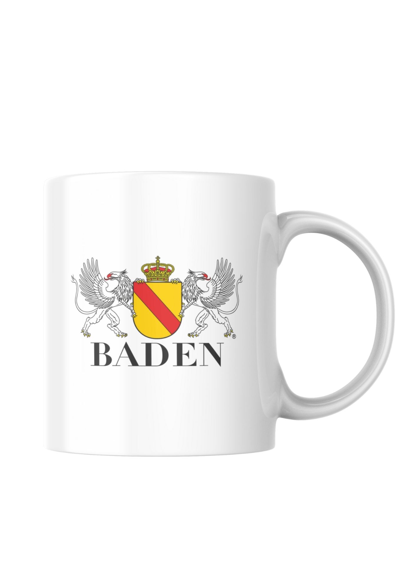 Diese klassische Tasse aus hochwertigem Porzellan ist komplett in Weiß gehalten und trägt stolz das Wappen von Baden mit Greifen.