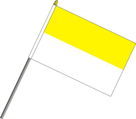 Die Hängefahne Gelb‑Weiß in Premium Qualität besteht aus glänzendem, wetterfestem Polyester (PG22, 100 %), mit einem Gewicht von ca. 110 g/qm. Sie ist ringsrum mit einer robusten Doppelnaht gesäumt und an der schmalen Seite mit einem starken Hohlsaumband ausgestattet, durch das ein Rundholz geschoben werden kann (Rundholz nicht im Lieferumfang enthalten). Ideal für den Einsatz im Innen- und Außenbereich!